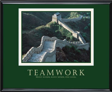 Early in my career, I was a consultant at a midsize firm, and one of my clients had quite the memorable poster hanging in the conference room. It was a gorgeous photo of the Great Wall of China with the phrase “Teamwork: Many Hands, Many Minds, One Goal” underneath.