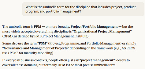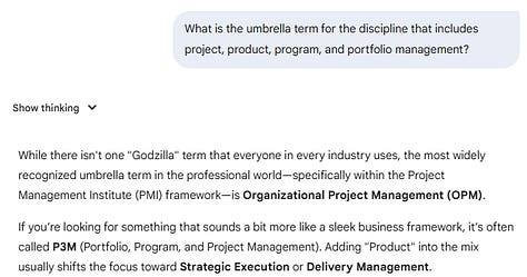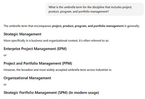The good news is there are options here. The favorite choice across the platforms appears to be “Organizational Project Management (OPM),” created by PMI and aligned with PMI’s polysmic approach for project management (although I don’t see them use the first word “organizational” very often). The AI platforms also shared a handful of general business terms, such as strategy and organization. Finally, there’s the moderately promising acronym of P3M, the three “Ps” intended to symbolize project, program, and portfolio, and the “M” for management.
