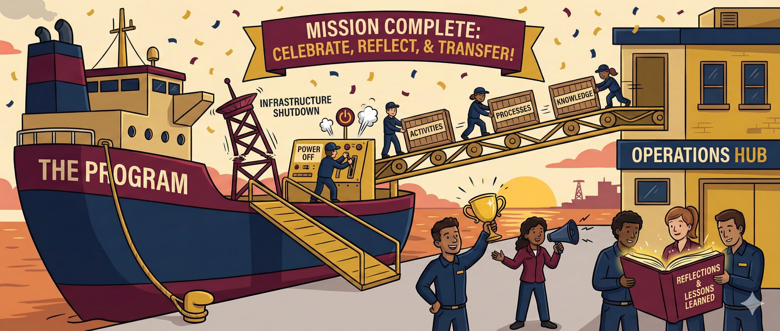 PMI does a great job detailing the desired endpoint for programs and the work underlying a successful transition and closeout of program operations. I’ve found it helpful to group these activities into three major buckets and added in a few components of my own - particularly around acknowledgment and communication.