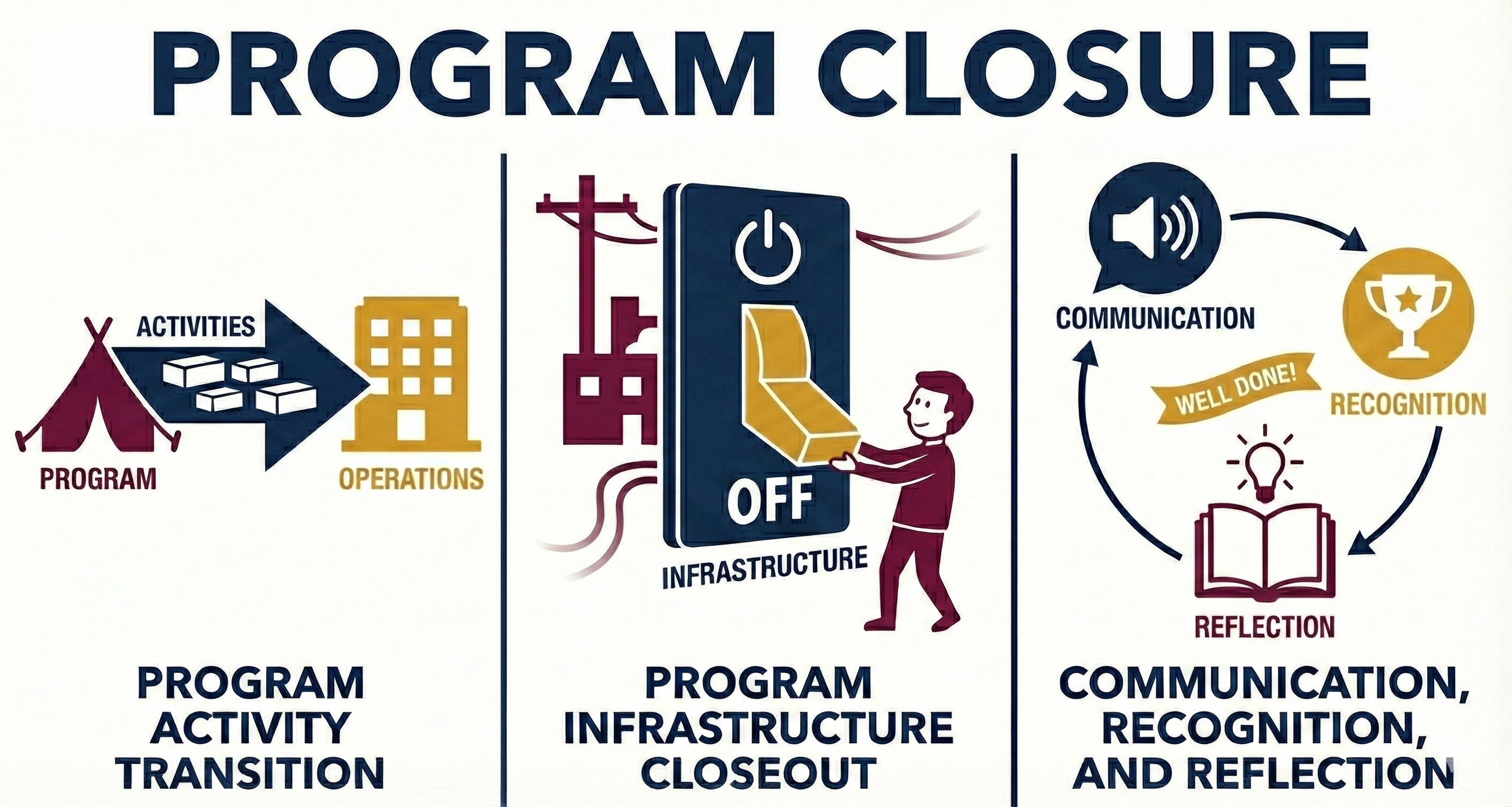 In these scenarios, the PgMP is formally tasked with completing program closure activities, which I grouped into three major buckets: 1) program activity transition, 2) program infrastructure closeout, and 3) communication, recognition, and reflection.