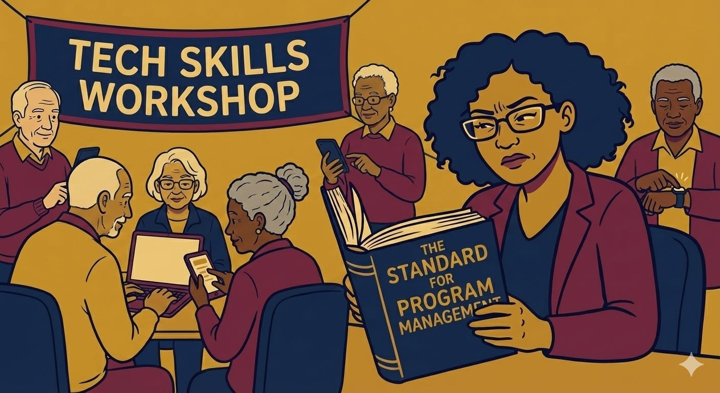 Zosia’s Challenge: Our fictional protagonist today is Zosia ( “ZAW-shah”, rhymes with “Sasha”), a program management professional (PgMP*) at a large non-profit organization. Zosia has led a program for the past four years, helping older adults learn to use new technologies to support their healthcare journeys (such as telemedicine, remote monitoring, wellness apps, and the like).